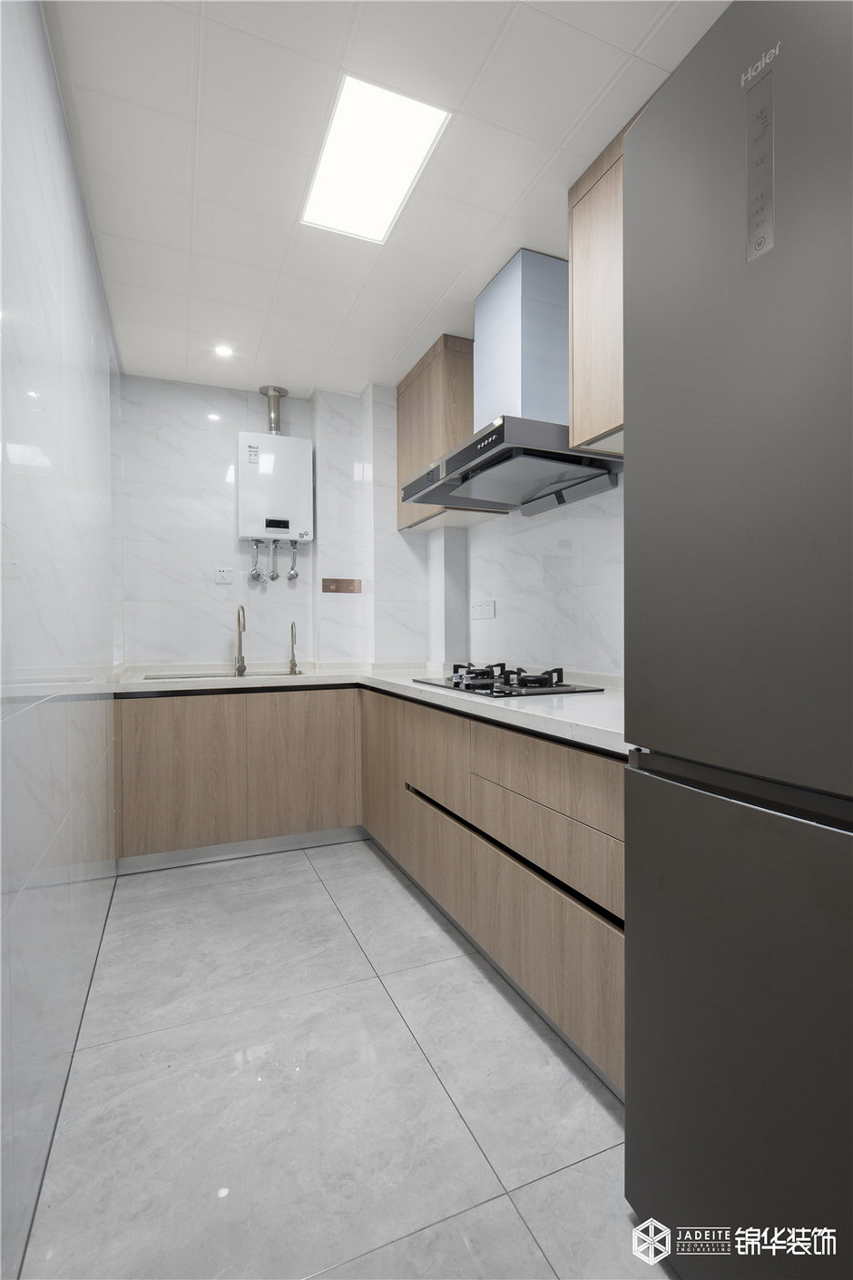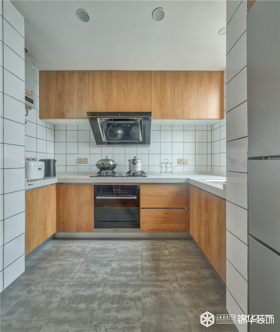 廚房敞開的設計,讓空間顯得沒有那么的局促,上方的壁櫥大大增加了收納功能。