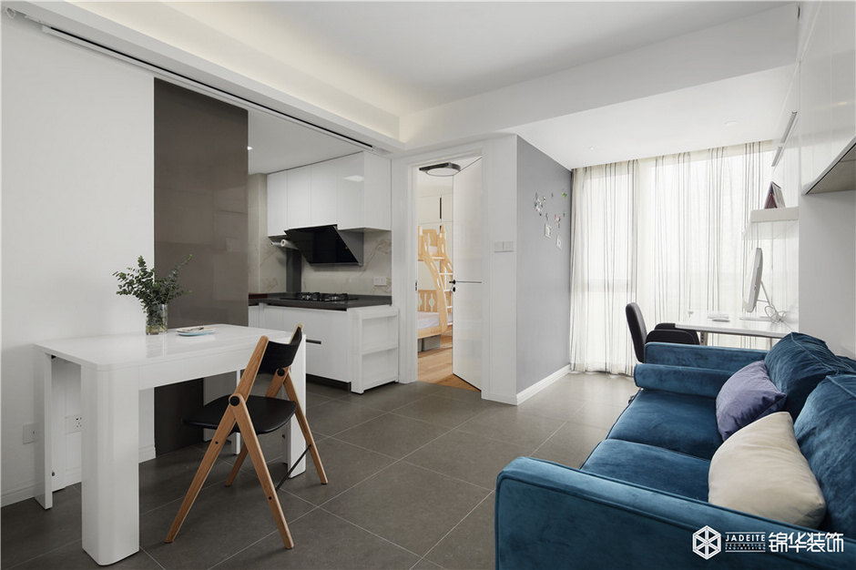 雖然本案是一個只有50平的公寓,但該有的功能全部具備,比如大型綜合儲物柜、全景書房、觀景飄窗閱讀臺、強大功能的廚房。