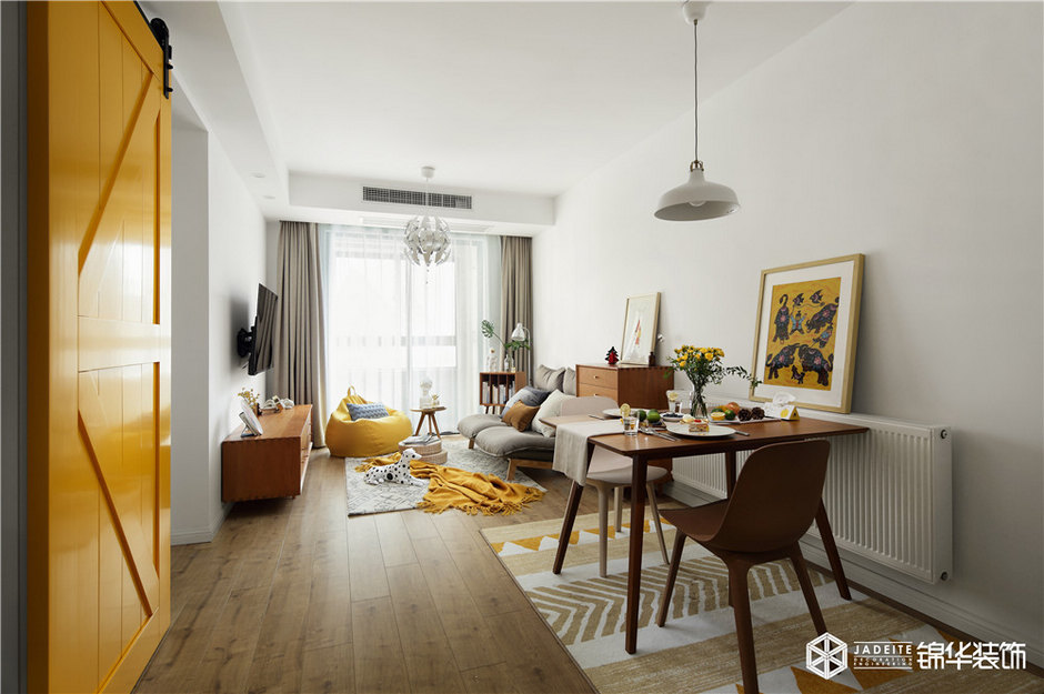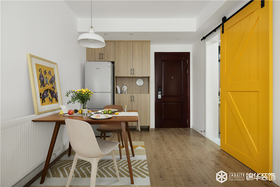 ▲明黃色谷倉門,是空間的視覺亮點之一,它作為廚房和客餐廳的分界線,既有效地節省了空間占比,又十分具有趣味性!
