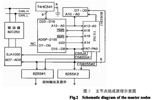 系統(tǒng)主節(jié)點(diǎn)結(jié)構(gòu)原理圖,如圖 2 所示。 中央處理器采用美國(guó)模擬器件公司生產(chǎn)的 ADSP2105。它是一種高性價(jià)比、性能成熟的 DSP 器件, 在一個(gè) 100ns 周期內(nèi),可以完成如下操作:取兩個(gè)操作數(shù),修改指向操作數(shù)的地址單元,使兩個(gè)操作數(shù)相乘 并將結(jié)果累加到一個(gè) 40 位的和中。由于程序循環(huán)在硬件內(nèi)完成,所以每 100ns 能執(zhí)行一次這些高級(jí)指令 的操作。WSI 的 PSD311 可編程外圍器件有效地將可編程邏輯、I/O 端口和存儲(chǔ)器集成在一塊芯片上,可 以實(shí)現(xiàn)本系統(tǒng)的外圍功能。ADSP2105 在與 PSD311 等外圍器件聯(lián)絡(luò)方面提供了很大的時(shí)序靈活性。它 可以為 4 個(gè)分開(kāi)的存儲(chǔ)器空間中的每一個(gè)單獨(dú)分配等待狀態(tài)數(shù)量,以適應(yīng)很寬的時(shí)序差別。我們?cè)?ADSP2105 的 “ 等待寄存器”為 EPROM、RAM 和外部存儲(chǔ)器的選通脈沖安排 1 個(gè)等待狀態(tài),即 200ns 周期 時(shí)間,以滿足 PSD311 120ns 器件的時(shí)序要求。由于總線的通路布在 ADSP2105 的里面,PSD311 的數(shù)據(jù)線 與 D15~D8 連接。ADSP2105 的 “ D22”線提供 PSD311 的 “ A14”地址線,BMS(Boot Memory Select)充當(dāng) EPROM 的片選并與 PSD311 的 “ A19”輸入相連接。 選用 SJA1000 作為 CAN 控制器,驅(qū)動(dòng)器使用 CAN 控制器接口芯片 PCA82C250。EEPROM 用作數(shù)據(jù) RAM,用于保存設(shè)置輸入的關(guān)鍵數(shù)據(jù),以防掉電時(shí)丟失。